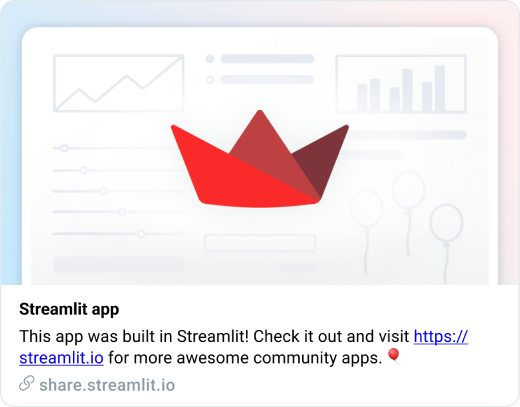Social media sites generate a card with a title, preview image, and description when you share a link. This feature is called a "share preview." In the same way, when you share a link to a public Streamlit app on social media, a share preview is also generated. Here's an example of a share preview for a public Streamlit app posted on Twitter: