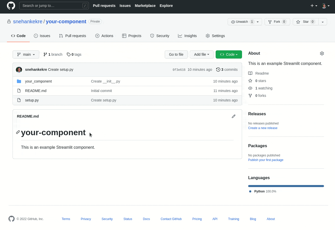 The component-template GitHub repo provides the folder structure necessary for PyPI publishing. But before you can publish, you'll need to do a bit of housekeeping: